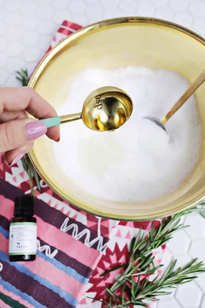 Let your essential oils fall into a tablespoon of the measuring spoon. I used less coin, so it would be a secondary scent for the rosemary, but you can adjust the ratio to less rosemary and more mint if you want.