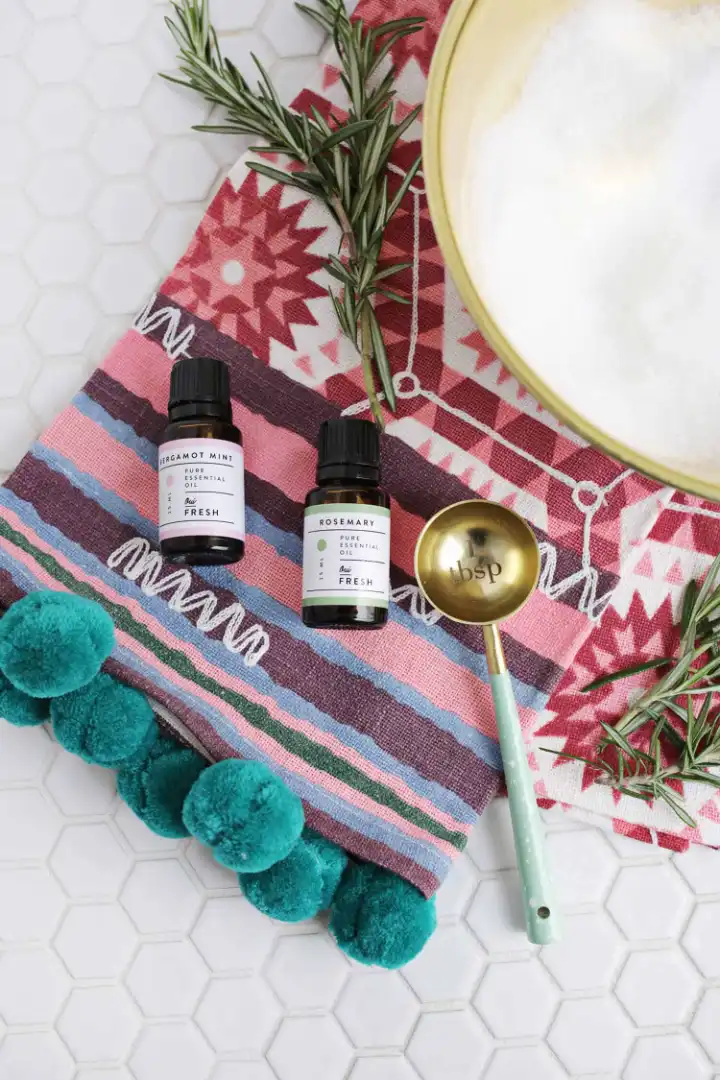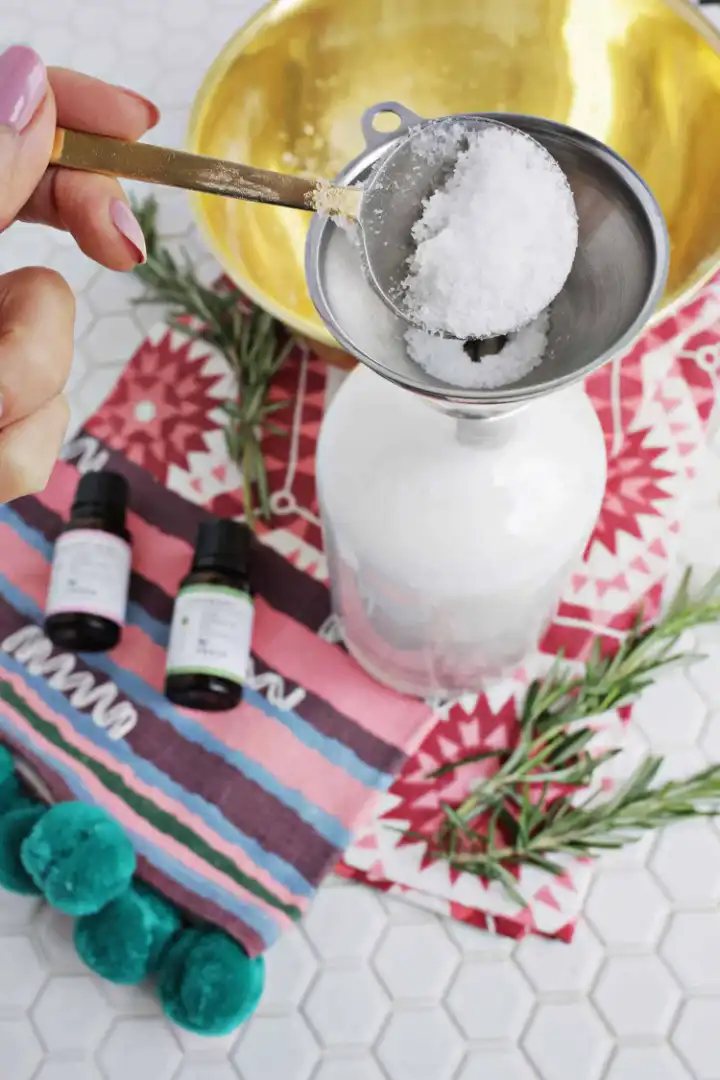 Tie a few sources of rosemary to the bottle with colored rope for a gifted idea, but definitely make a double batch because you also want your own stock. To use, just pour 1 cup of bath salts into a warm bath and stir with your hand to spread the salt through the water.
