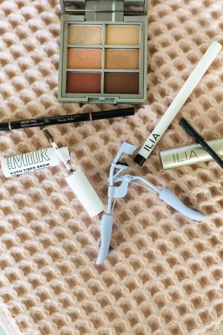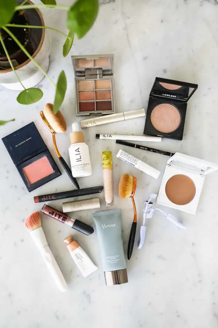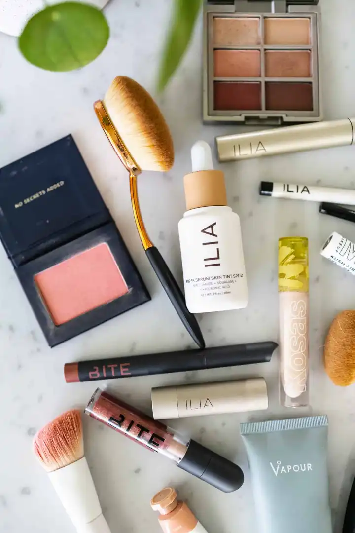Vapour Essential Daily Primer / ILIA Super Serum Skin Tint / Kosas Revealer Concealer / Anastasia Brow Wiz / KUSH Fiber Brow / ILIA Limitless Lash Mascara / ILIA Necessary Eyeshadow Palette / ILIA Clean Line Gel Liner / LAWLESS Velvet Matte Bronzer / Glossier Cloud Paint / ILIA Color Block Lipstick